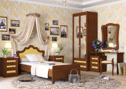 51.301 Тумба прикроватная - 2 шт. 51.106.04 Кровать 900 - 1 шт. 51.202.04 Шкаф двухдверный - 1 шт. 51.606.01 Стол туалетный - 1 шт. 51.604 Зеркало - 1 шт.