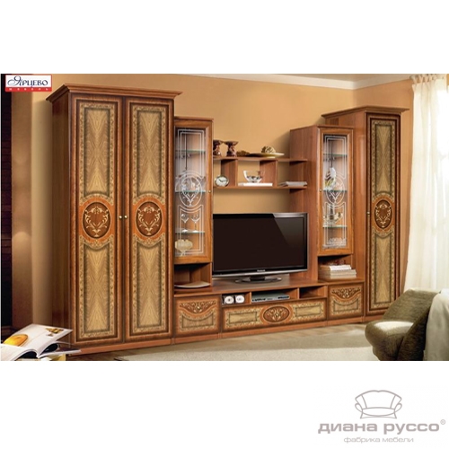 Стенка «Карина-1» необычайно красива, с уверенностью можно утверждать, что данная модель станет великолепным украшением гостиной комнаты, интерьер которой решен в классическом либо даже в дворцовом стиле. Применение экошпона с рисунком, нанесенным методом шелкографии на фасадах, имитирующим инкрустацию ценными породами дерева, создает неповторимый визуальный образ.